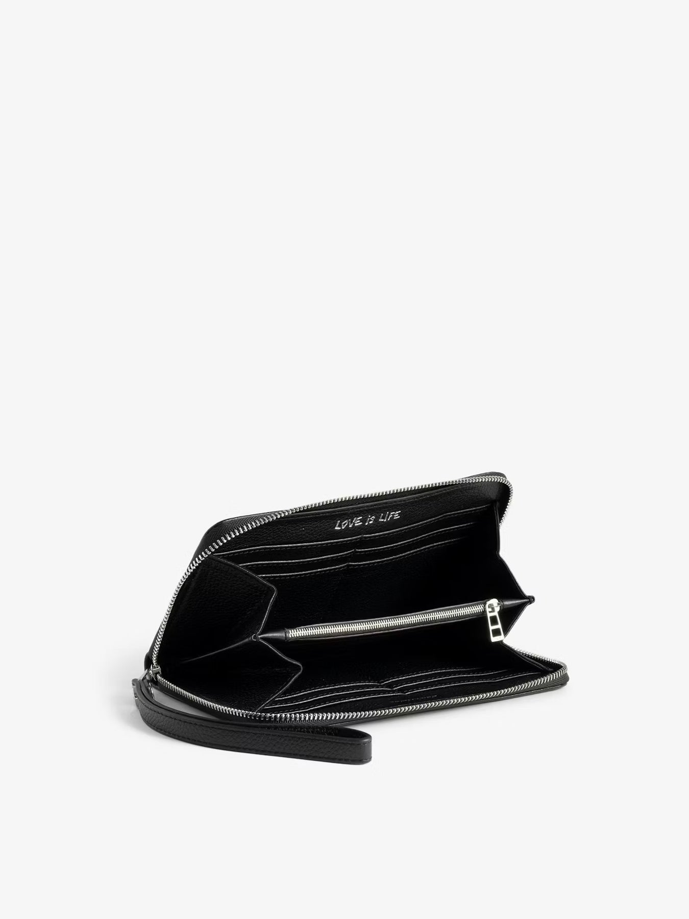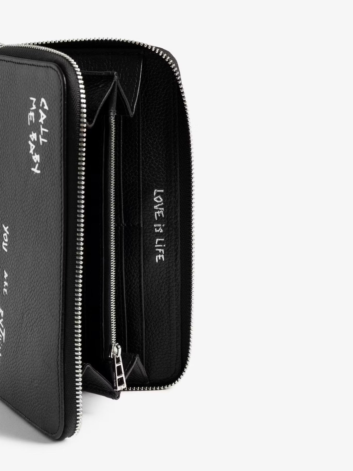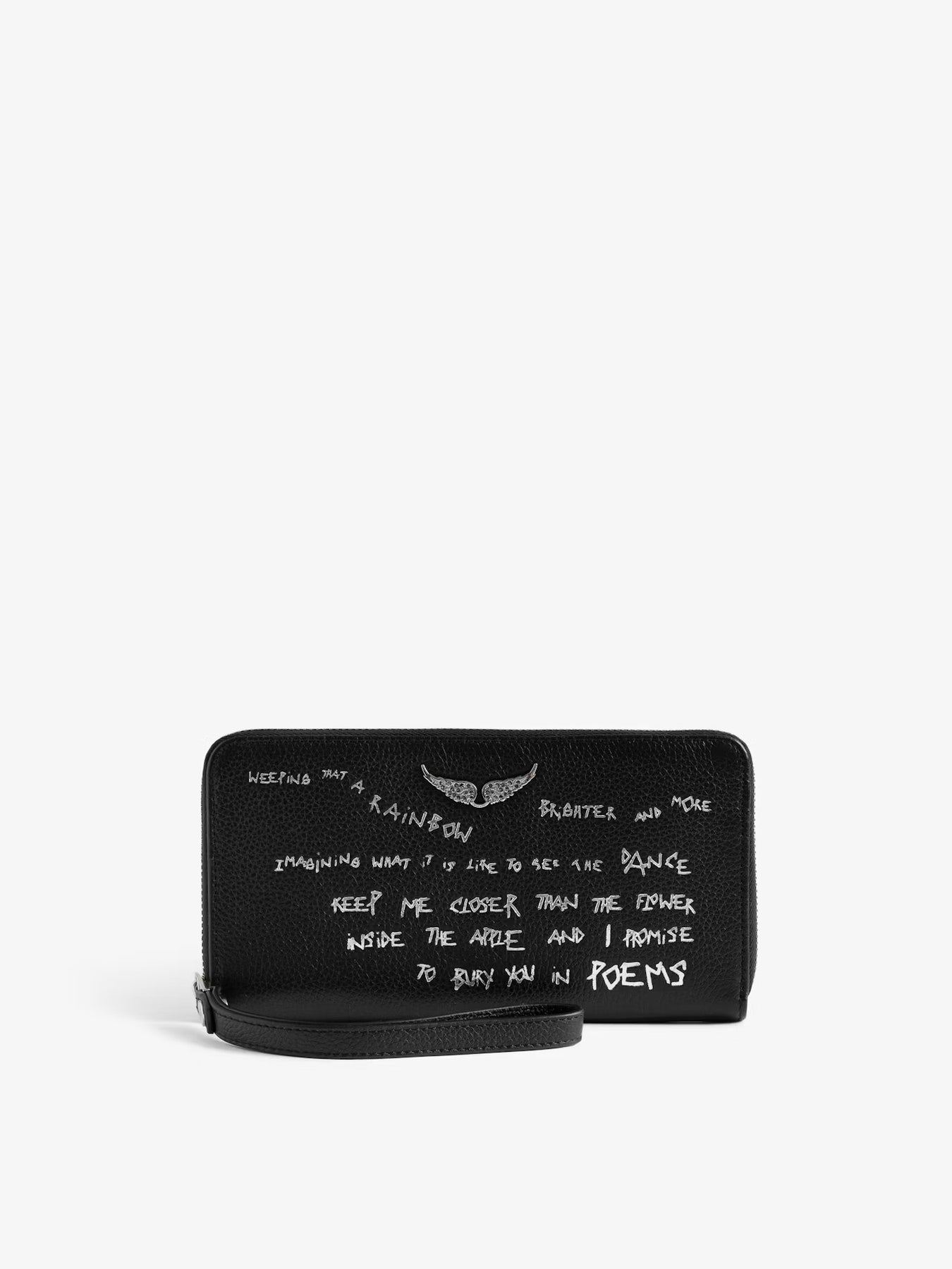 Billetera de piel con acabado granulado, adornada con alas de pedrería. Estampado de grafiti.