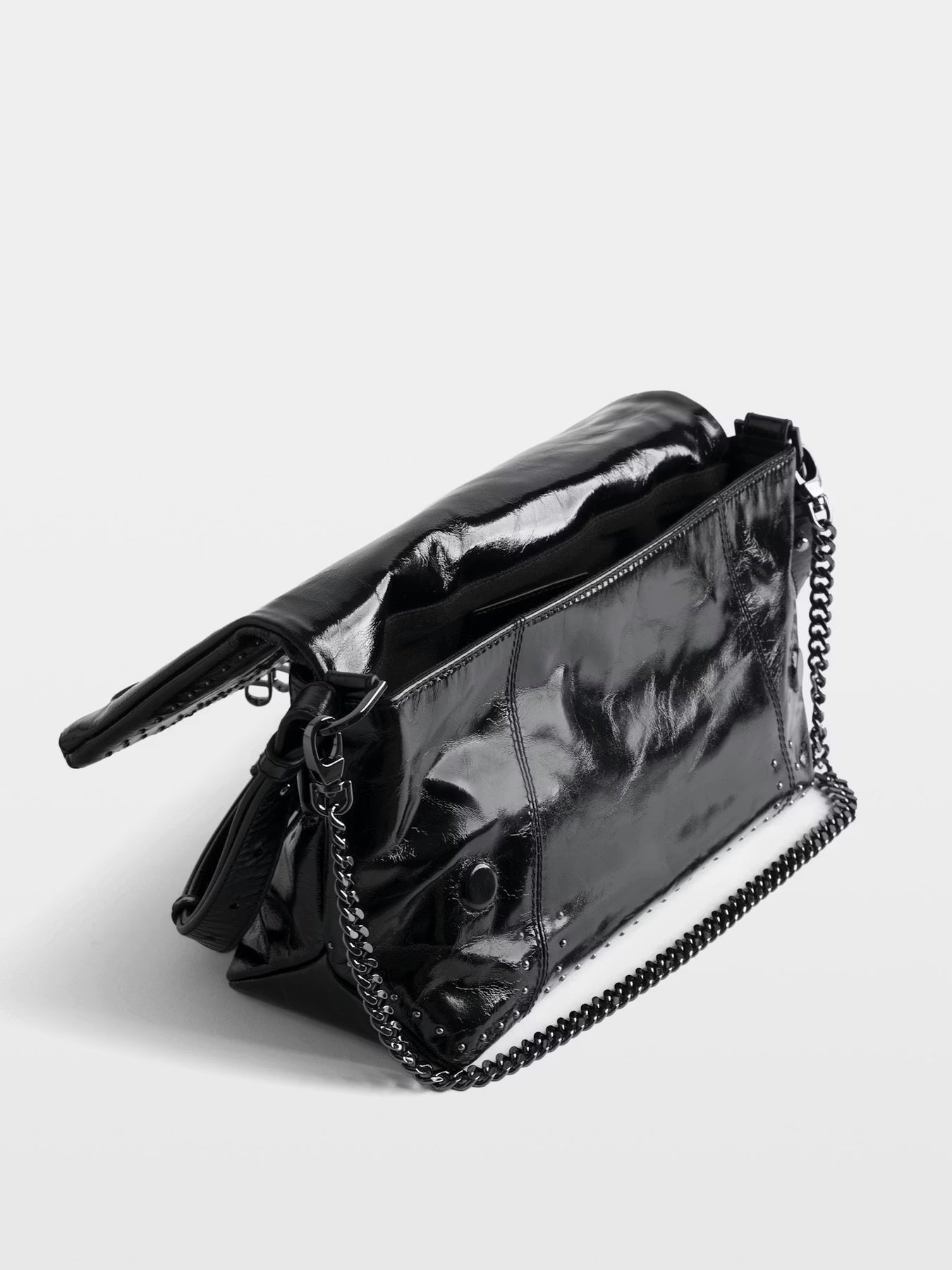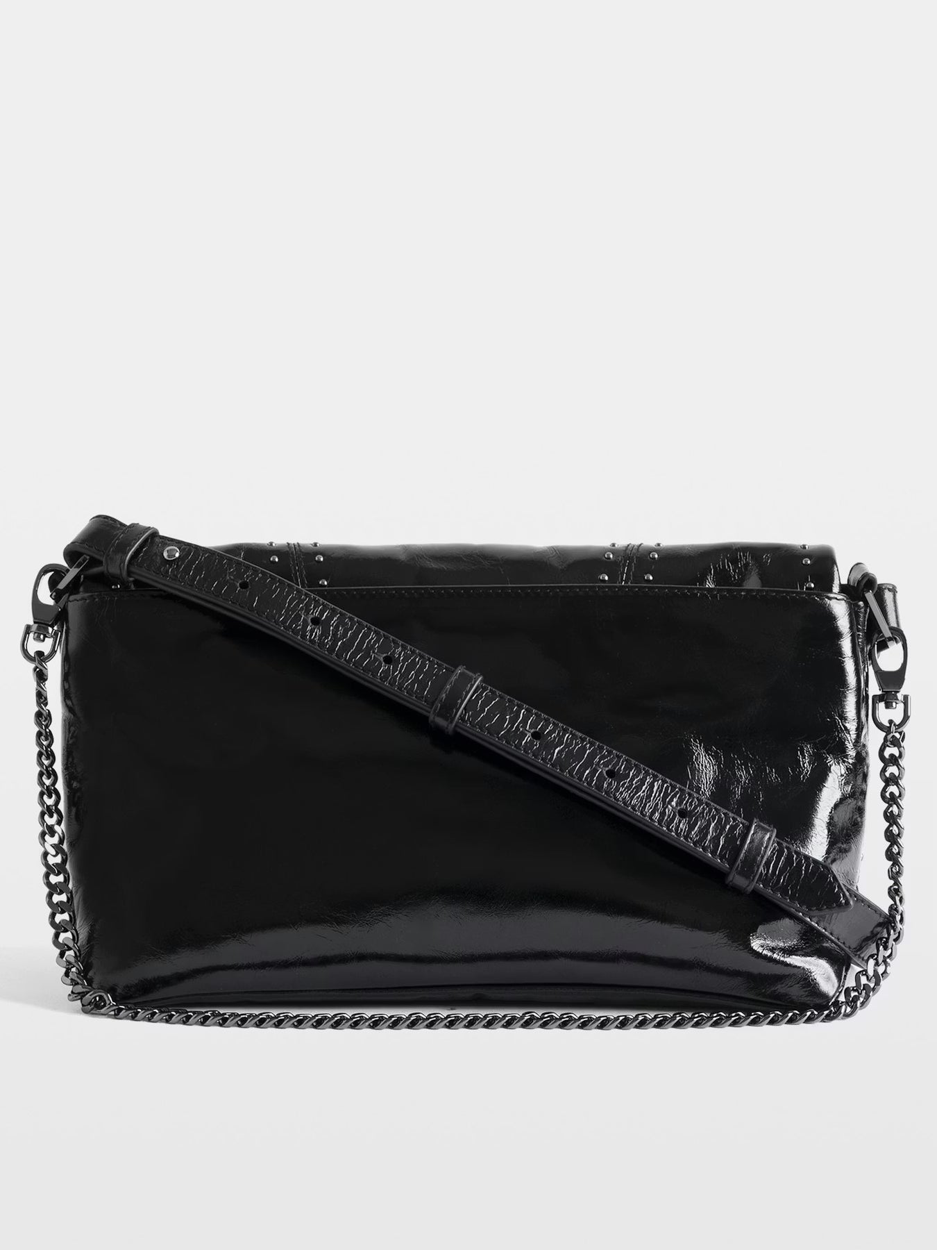 Cartera de charol con efecto vintage adornado con tachuelas, con correa para el hombro, cadena y alas.