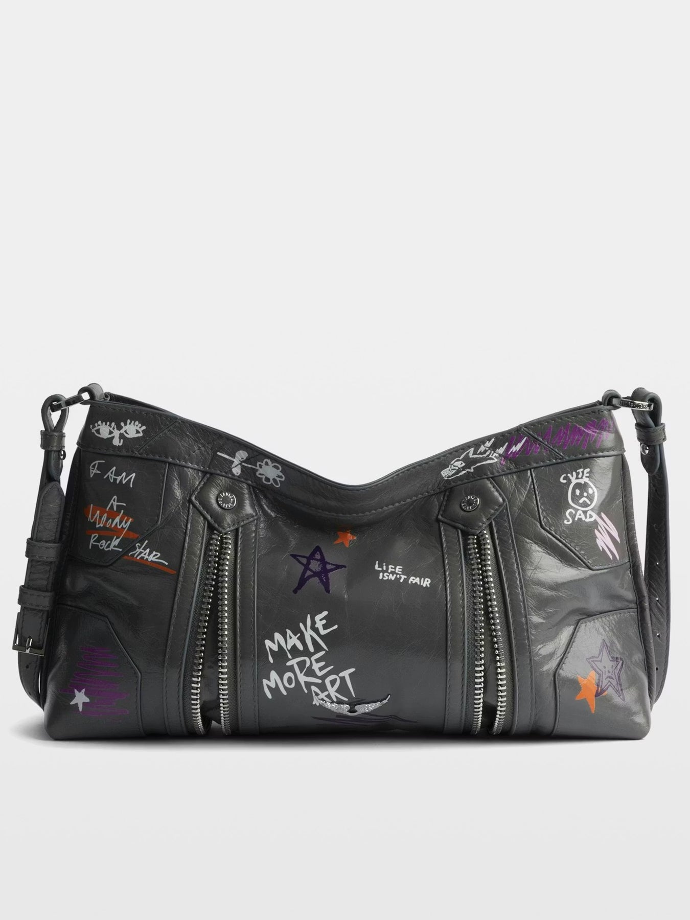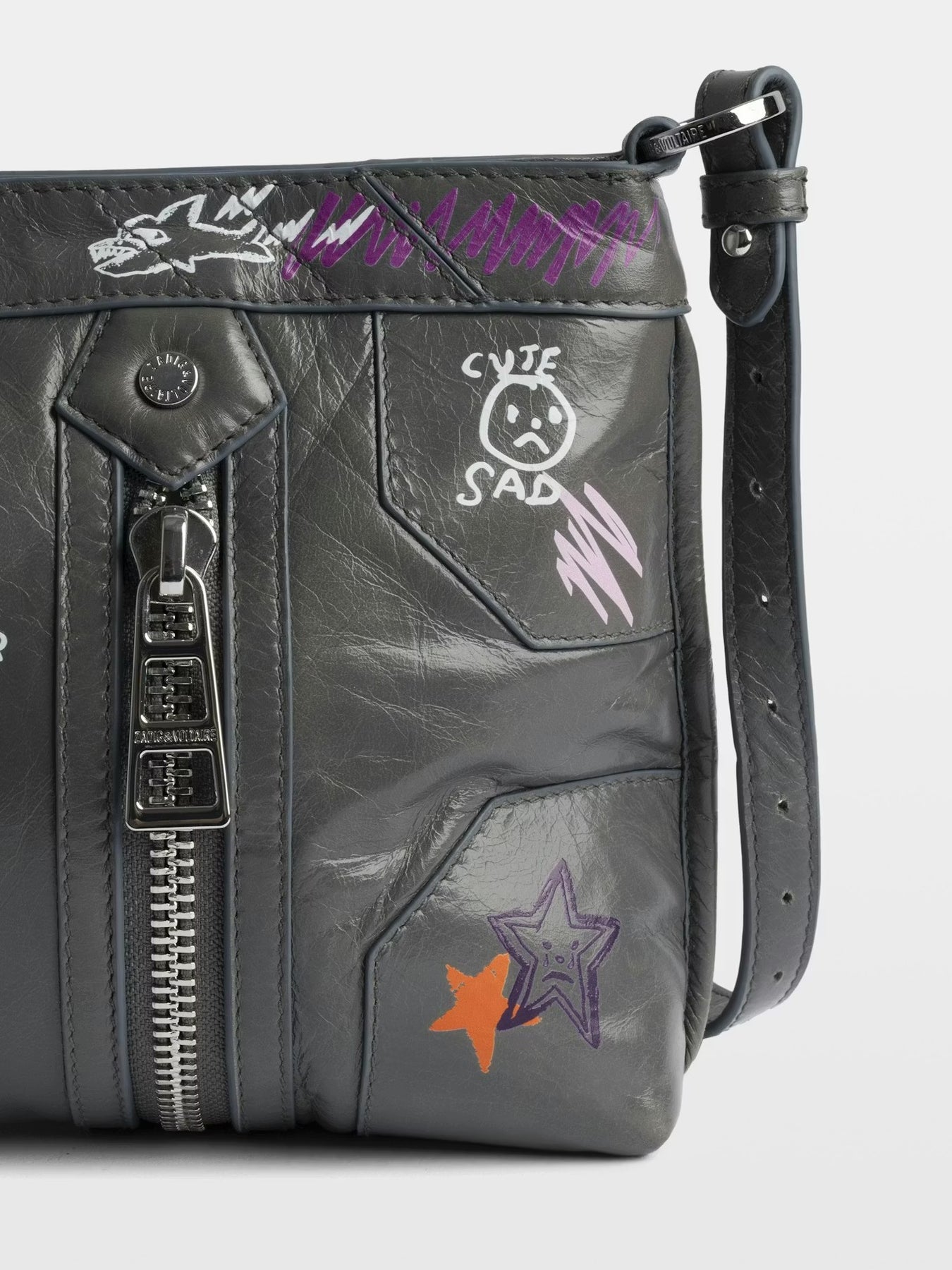 Cartera de cuero en charol de estilo vintage, con correa de hombro ajustable y estampados de alas y Humberto Cruz.