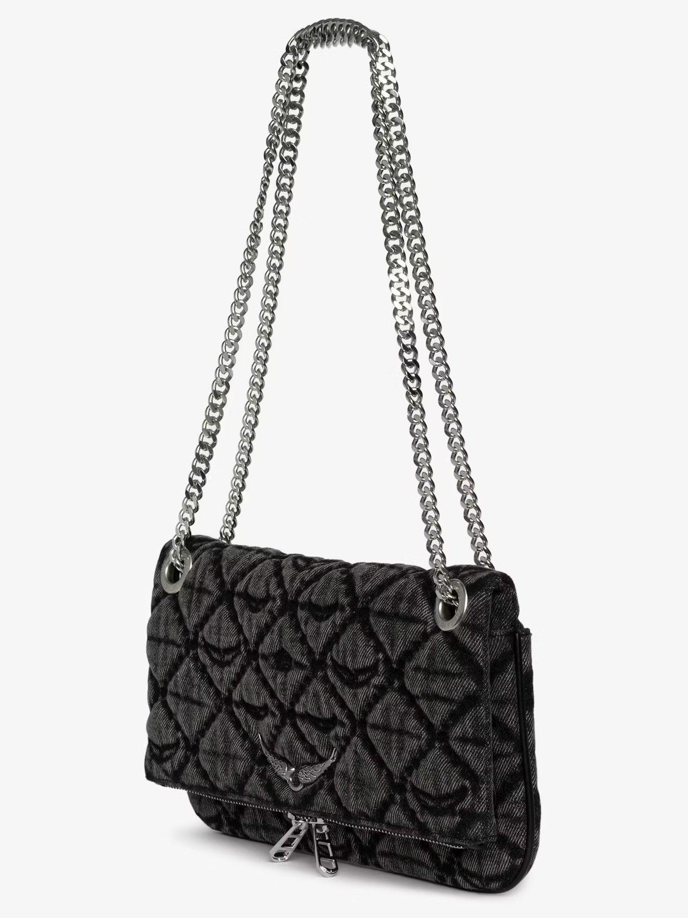 Cartera de mezclilla con cadena metálica deslizante y alas distintivas.