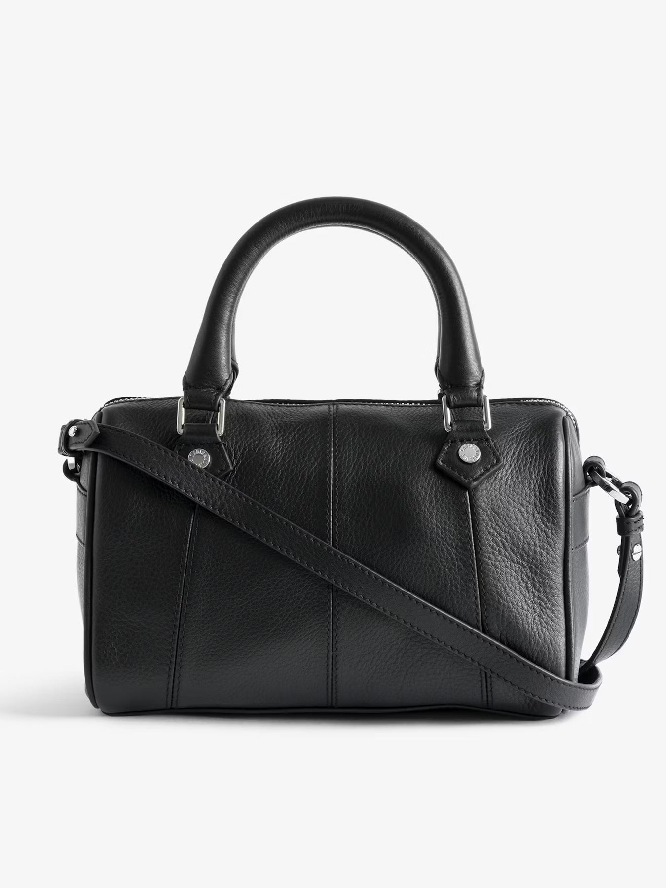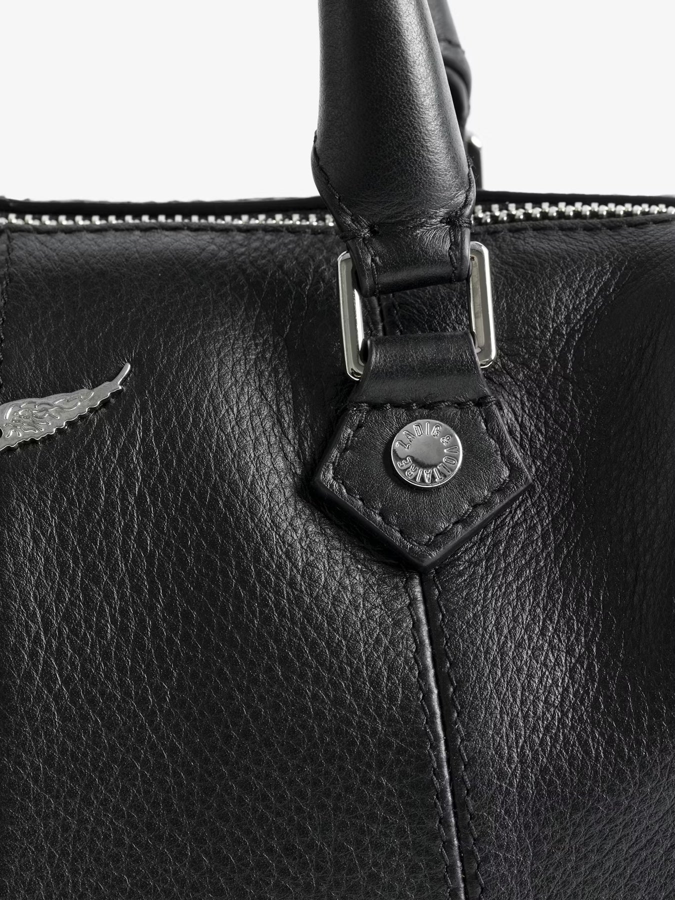 Cartera de cuero granulado, correa de hombro ajustable y asas con alas metálicas distintivas.