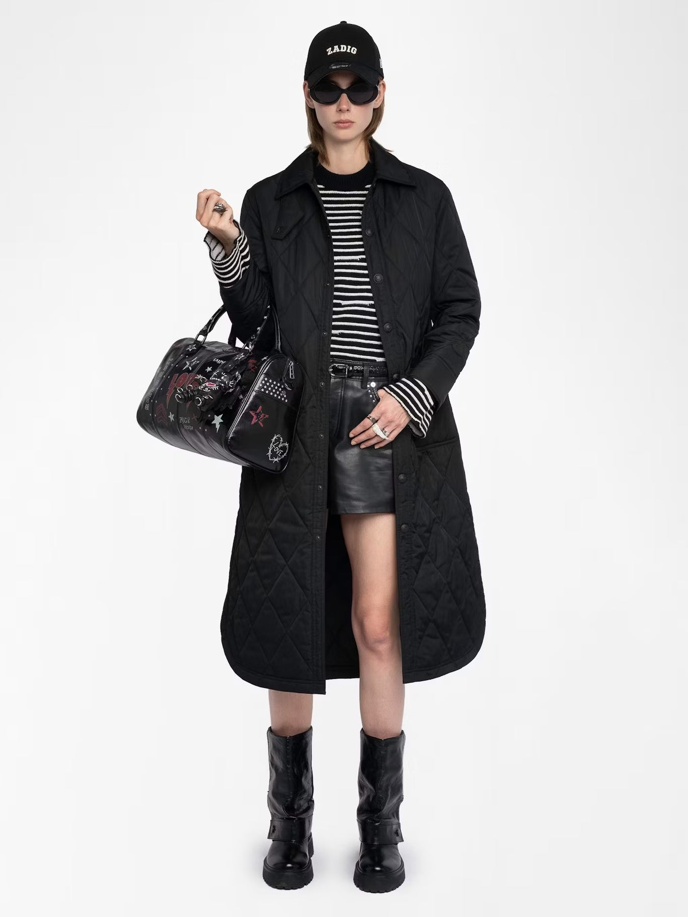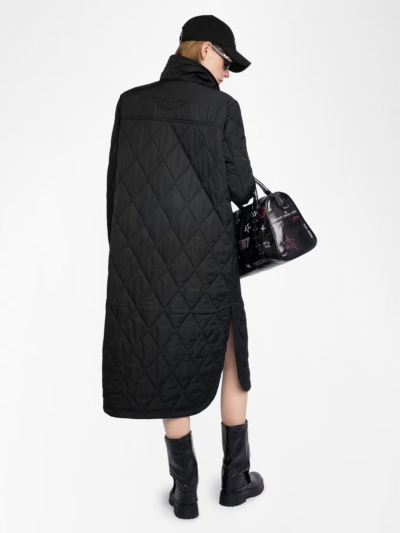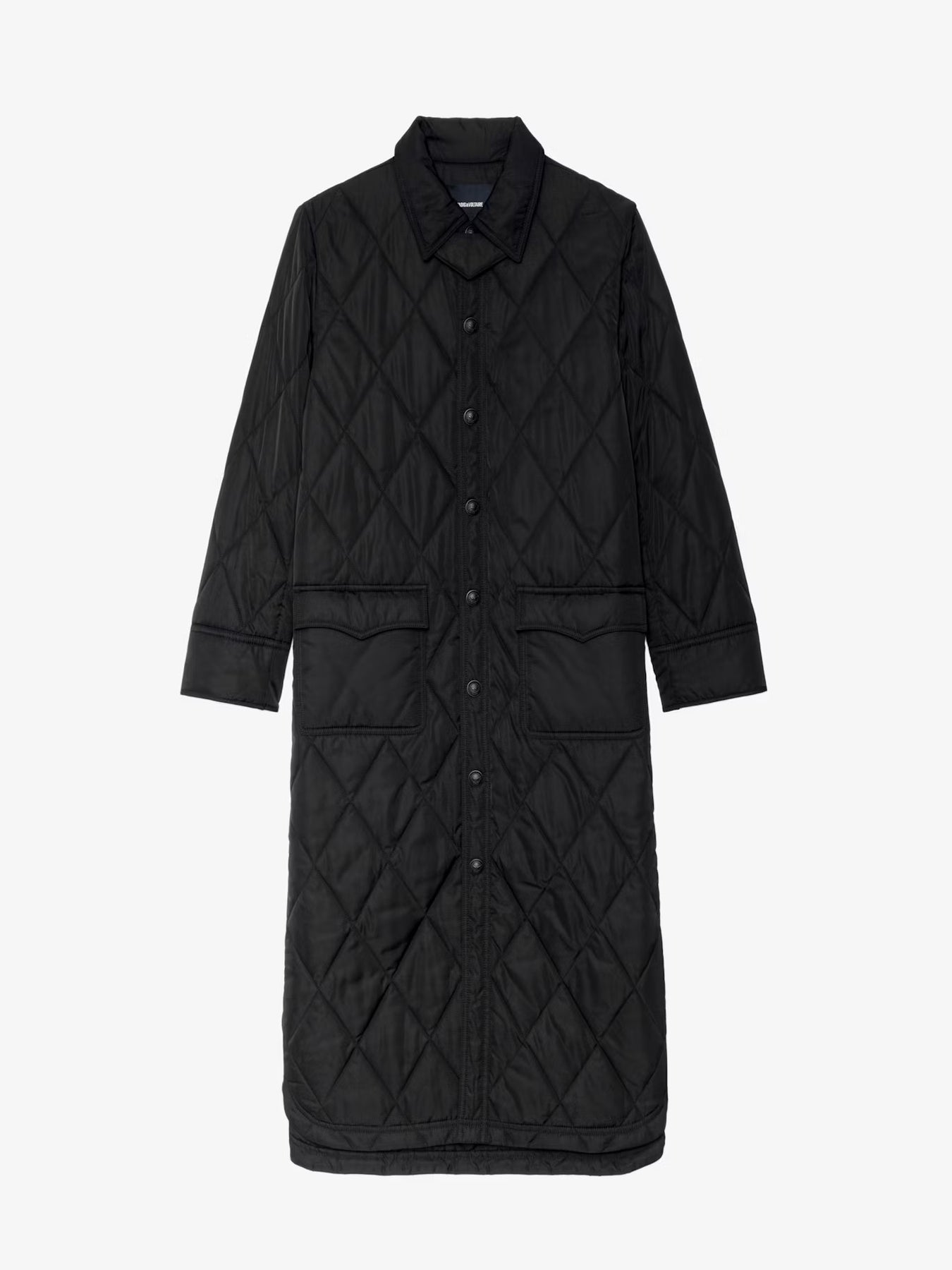 Parka larga y acolchada con múltiples bolsillos y cierre de botones.