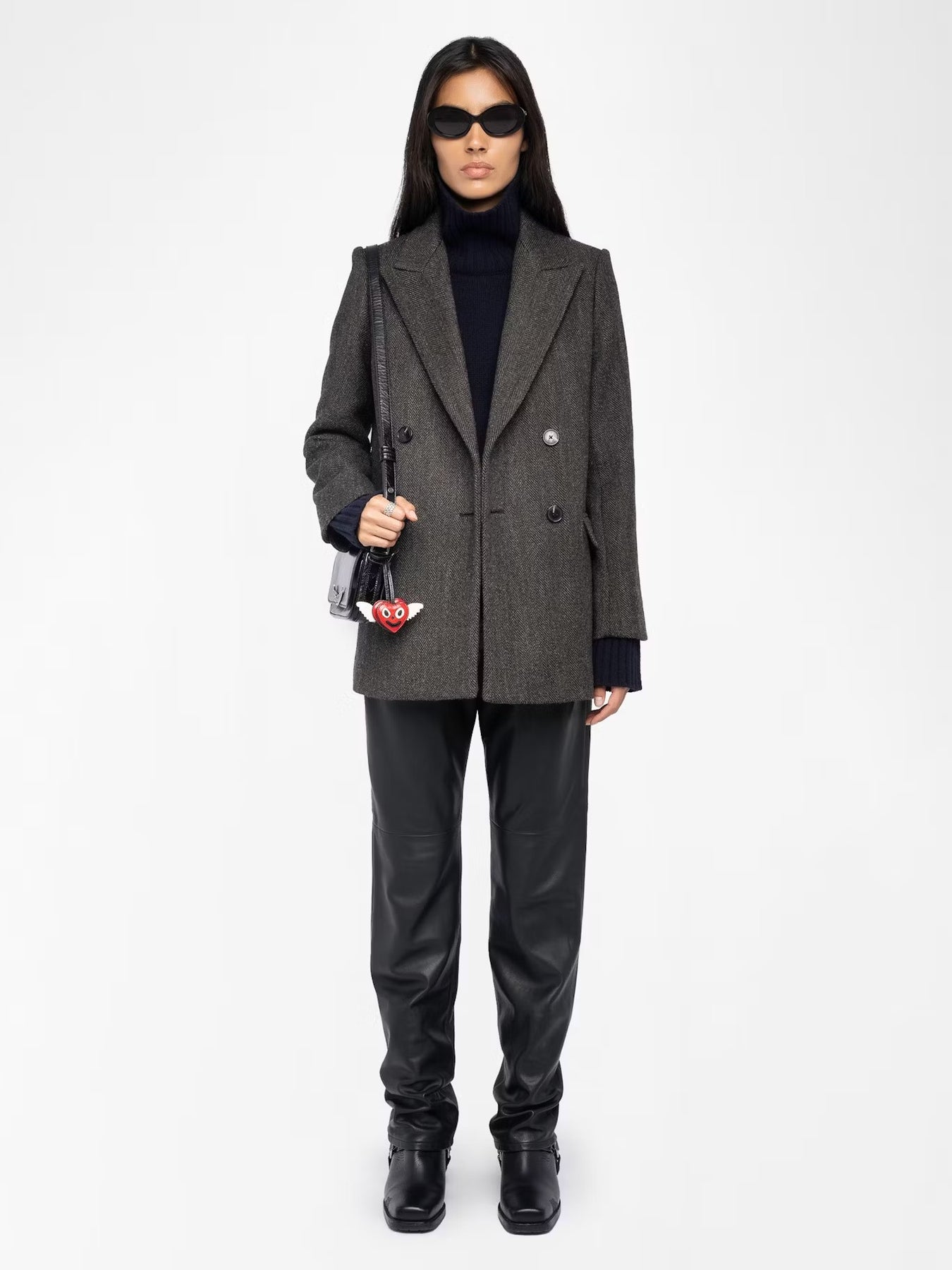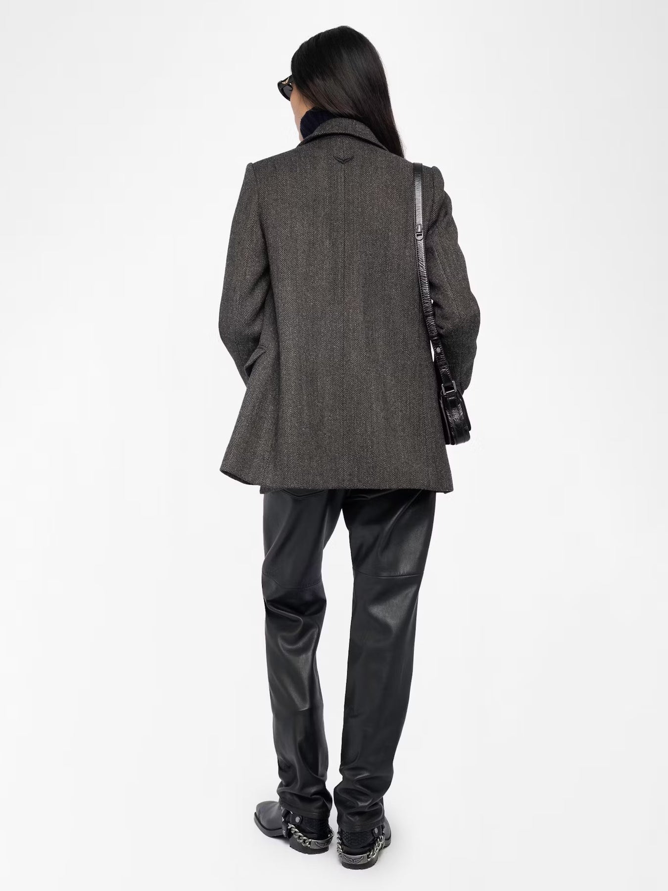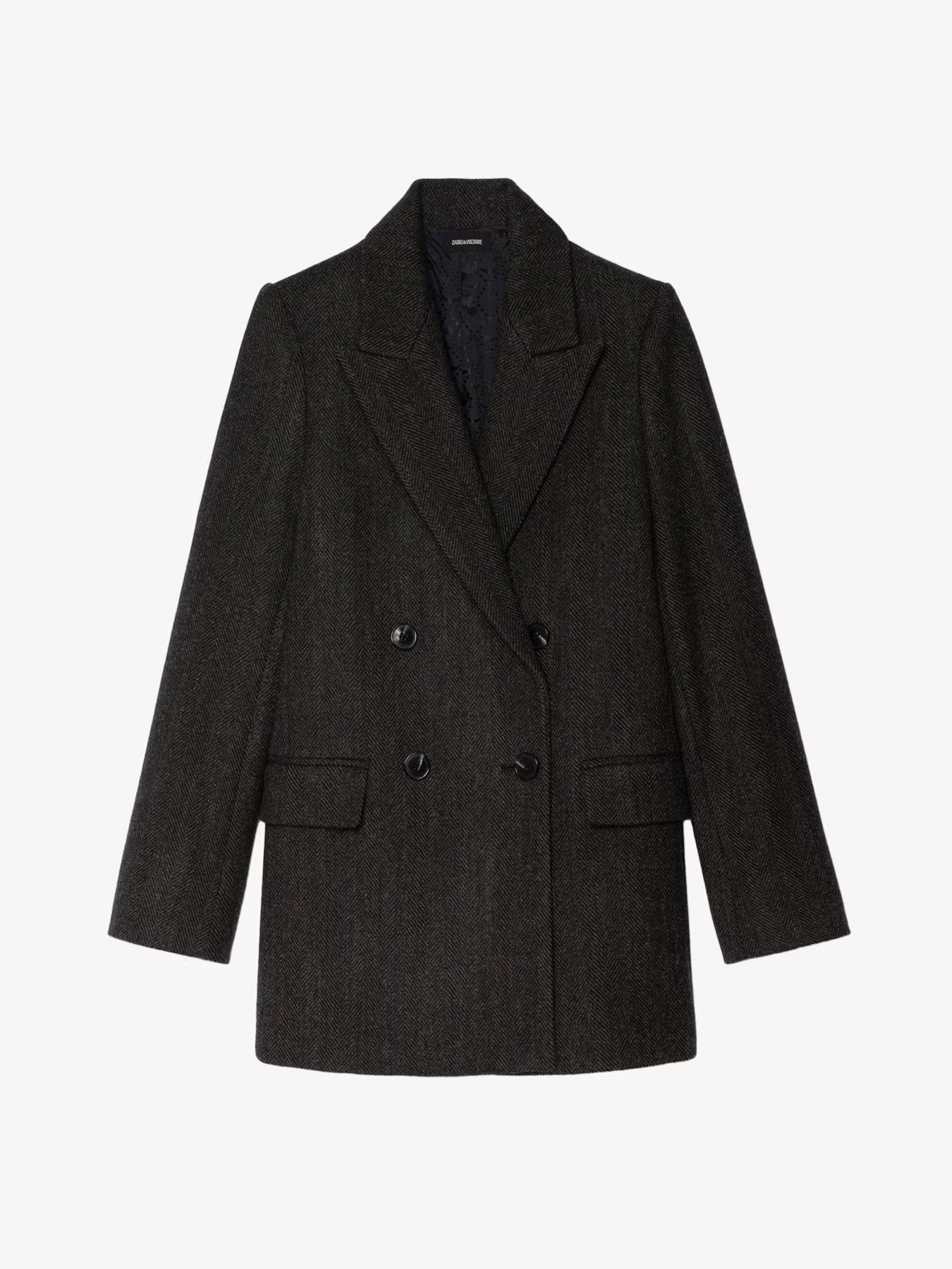 Abrigo en espiga de mezcla de lana, cierre cruzado con botones y mangas largas.
