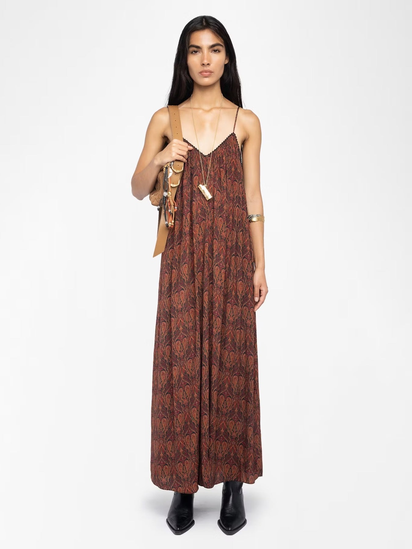 Vestido largo plisado en viscosa estampada, estilo lencero, escote de encaje y tirantes ajustables.