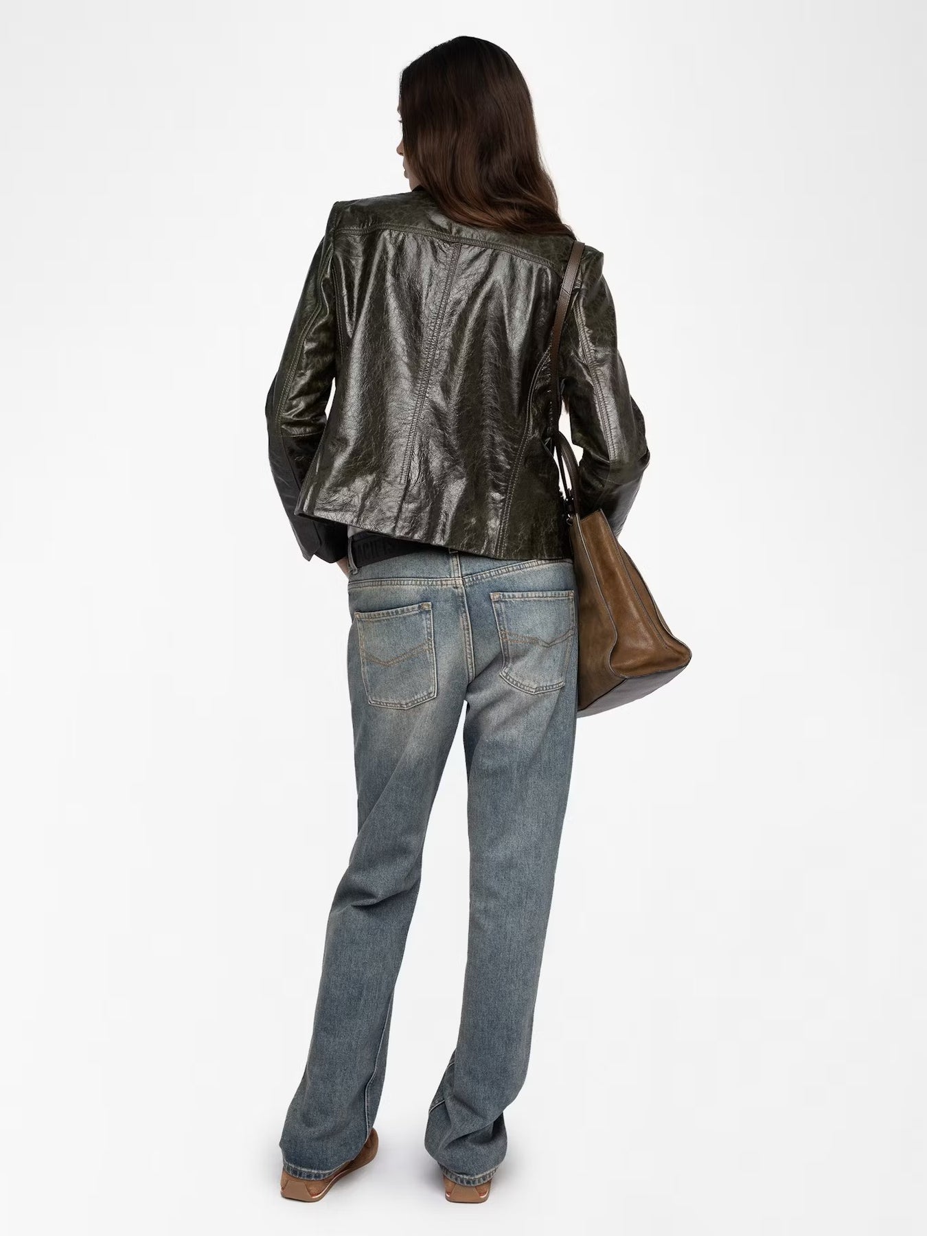Chaqueta entallada con botones al frente y alas de cuero brillante repujado.