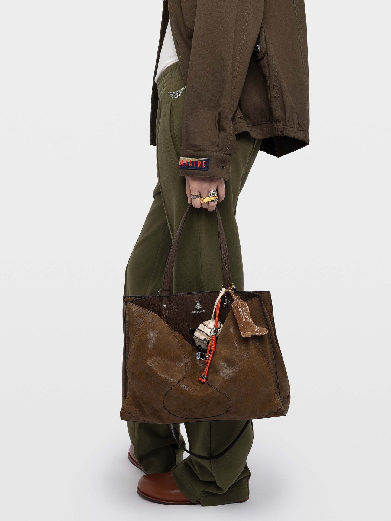 Pantalón recto de felpa verde con bolsillos y el emblemático logo de alas en strass.