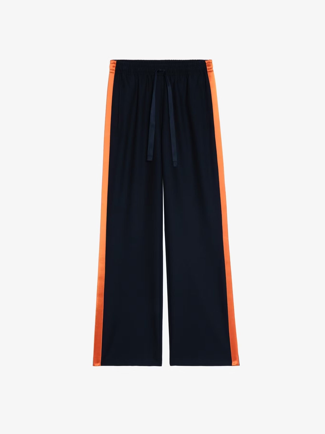 Pantalón recto de corte sastre, estilo deportivo, con rayas de satén y cintura elástica.