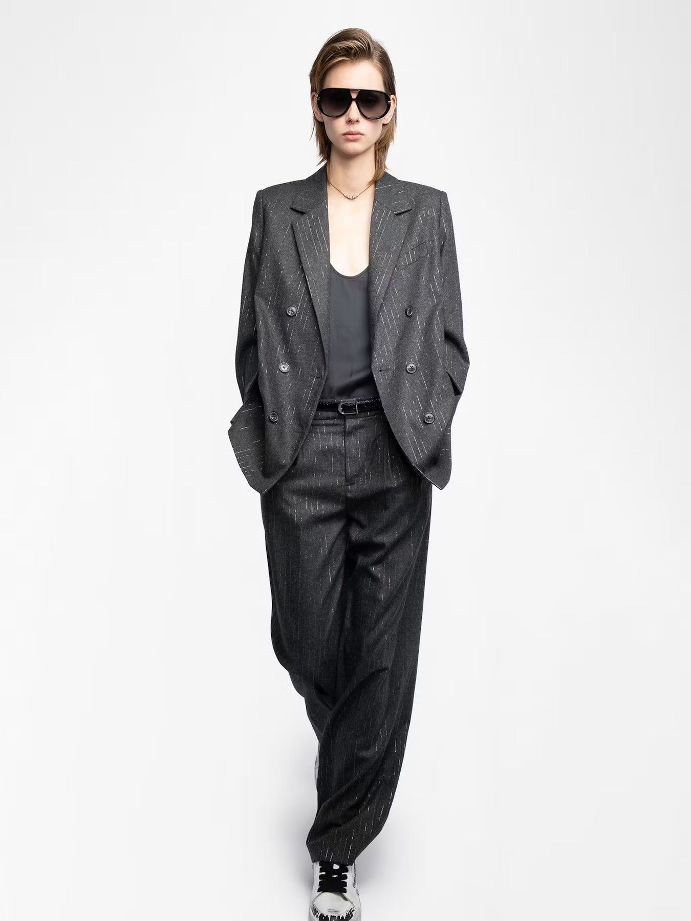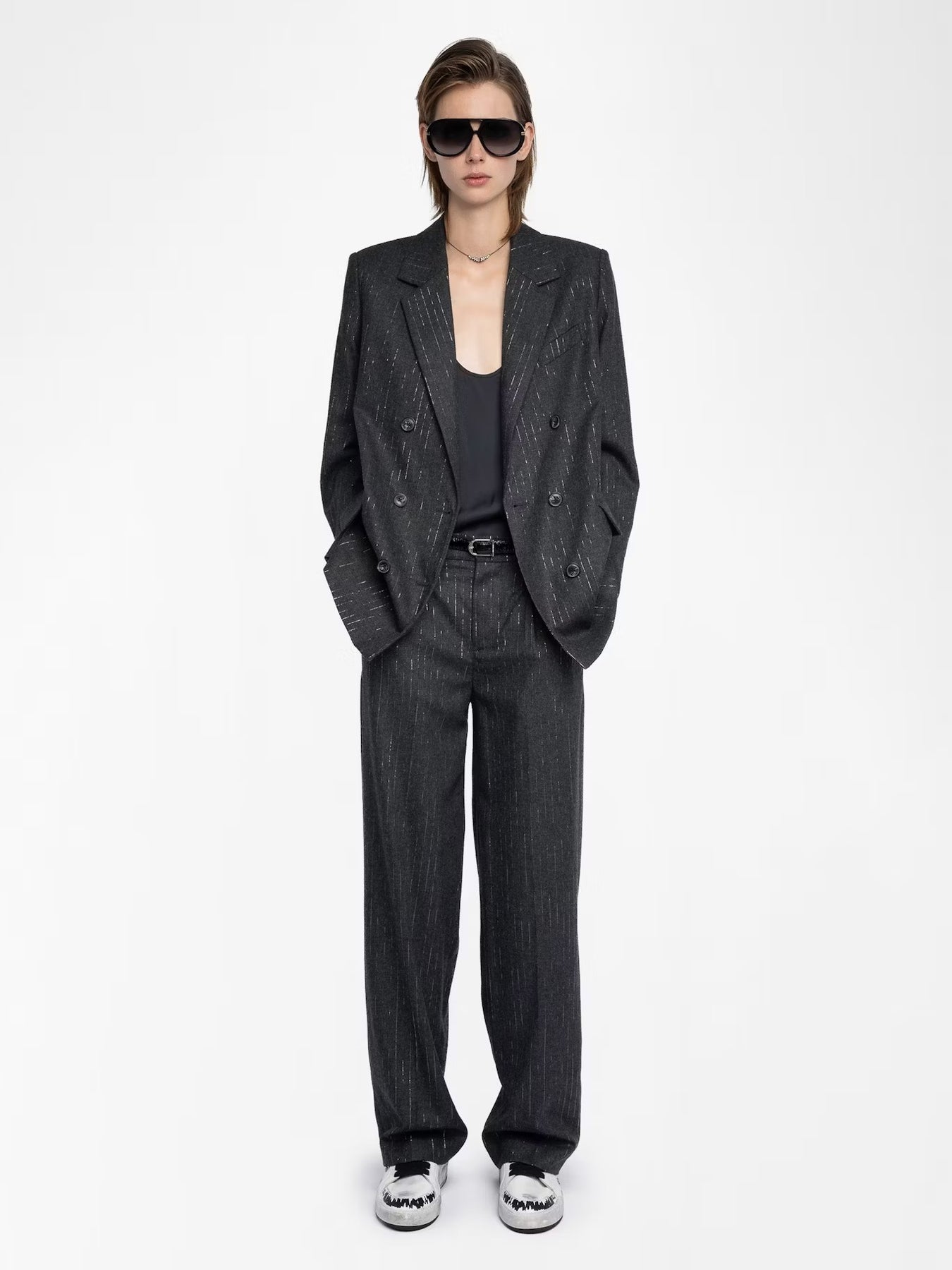 Pantalón recto de franela con rayas brillantes.