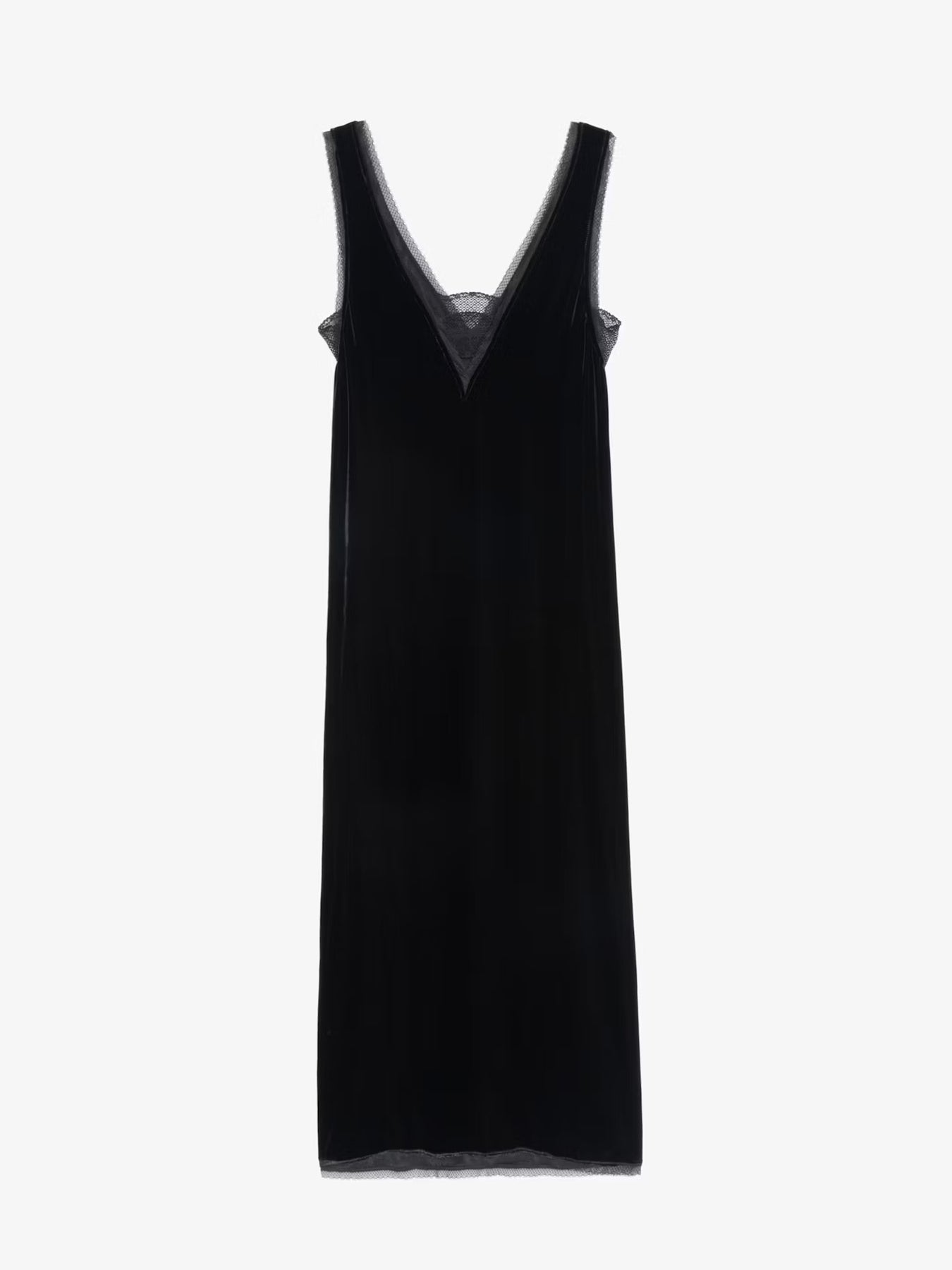 Vestido largo en terciopelo liso, estilo lencero y encaje francés.