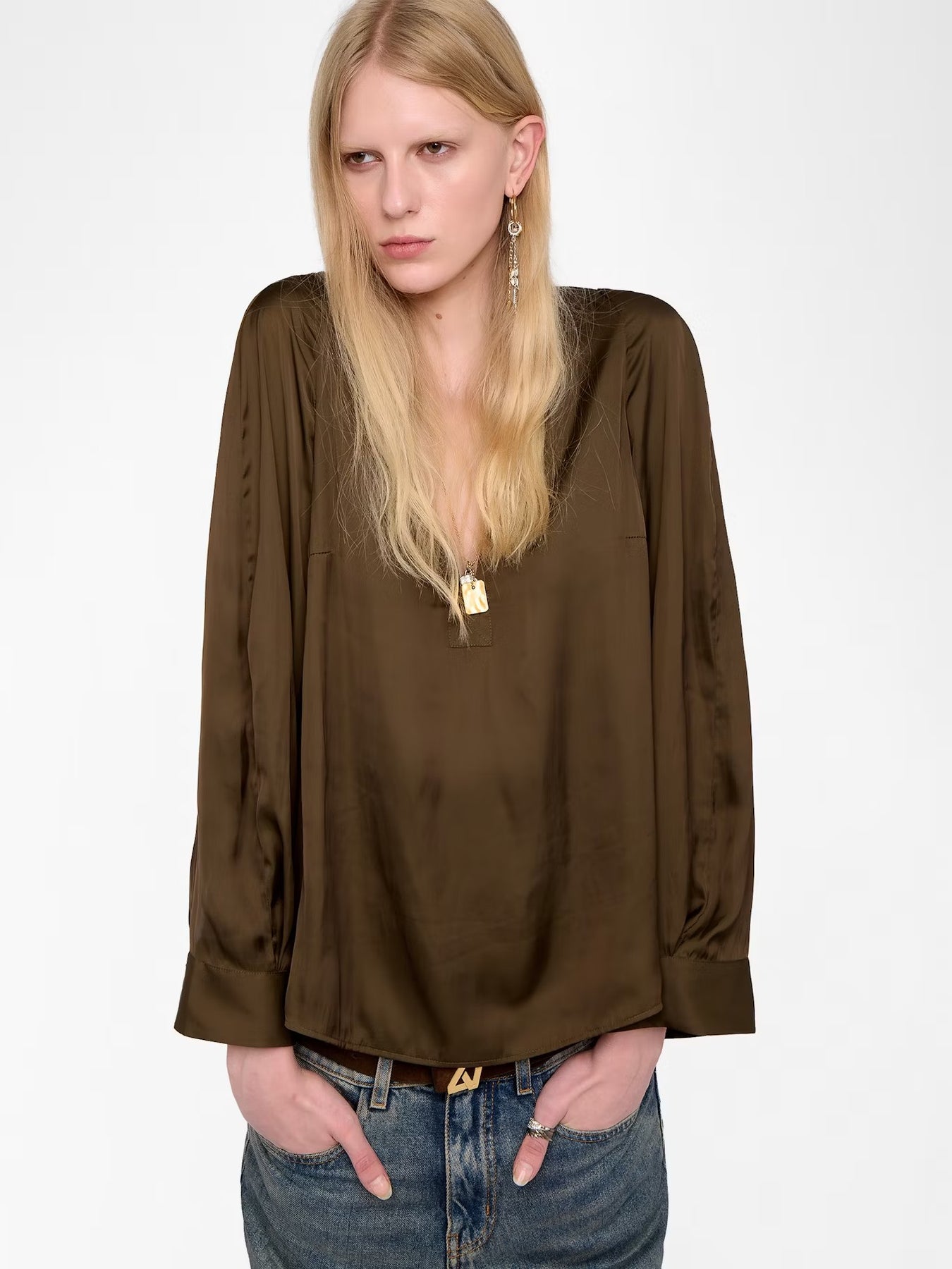 Blusa de satén con mangas largas y escote en V.