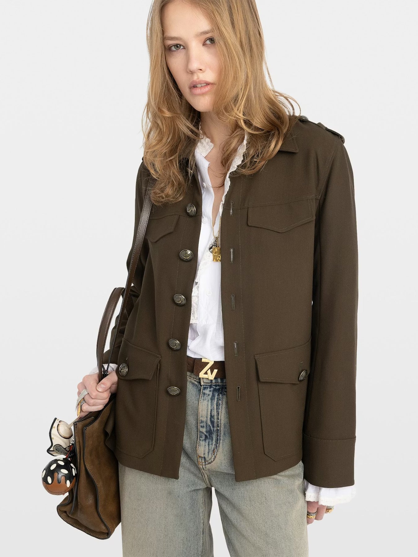Blazer sastre estilo militar con cierre de botones y múltiples bolsillos.