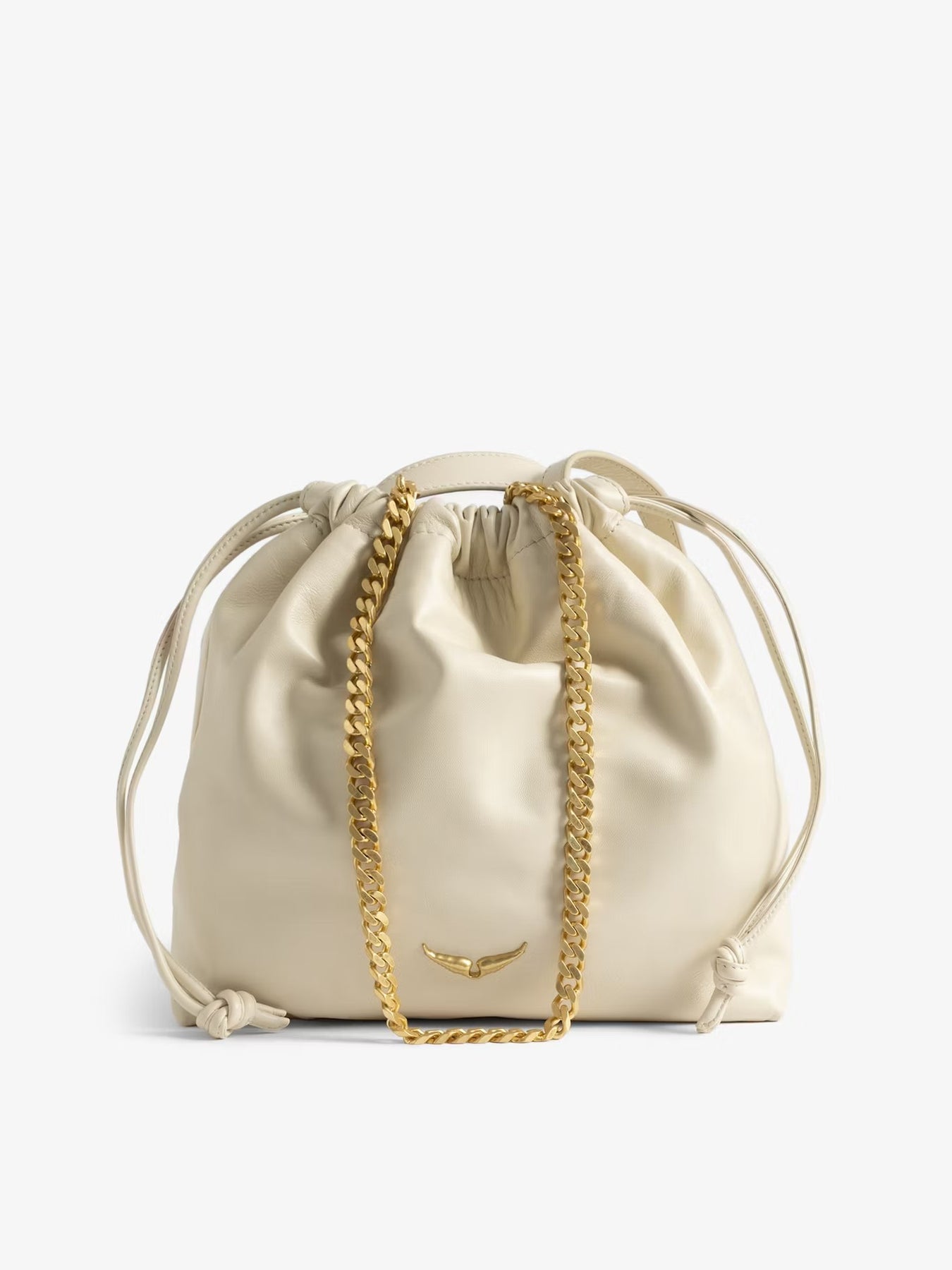 Cartera de cuero de cordero con correa de hombro de cadena y alas distintivas.