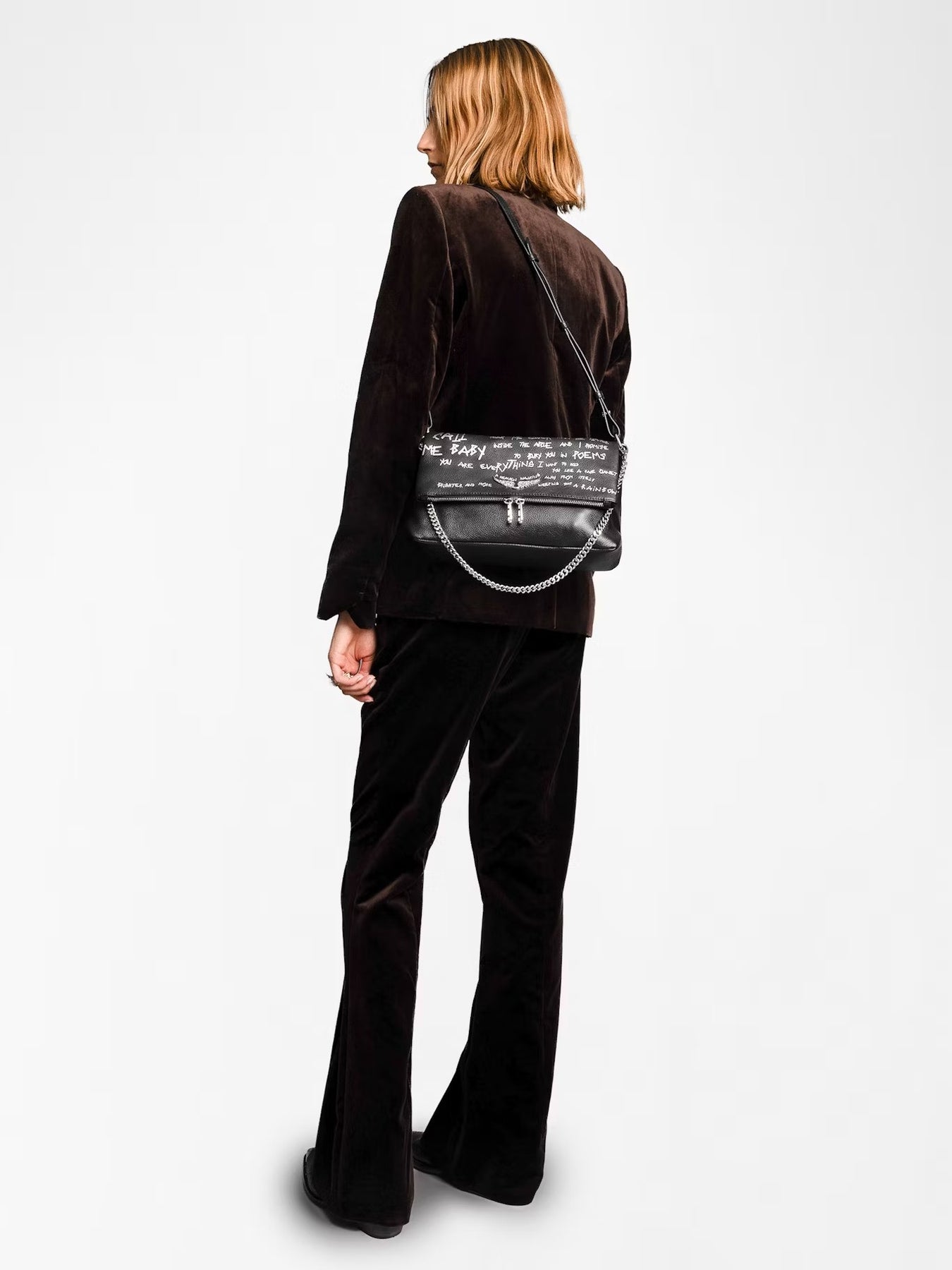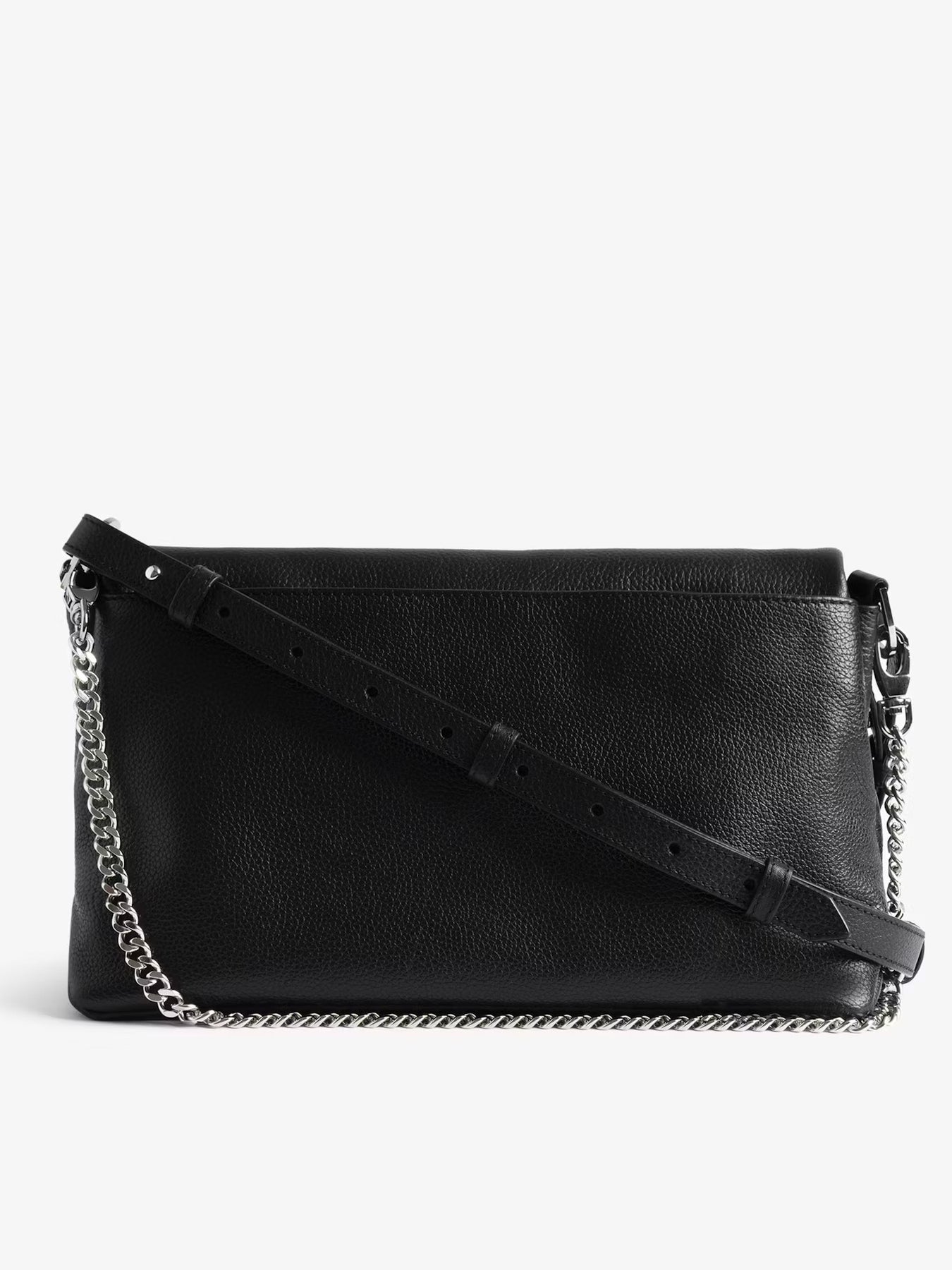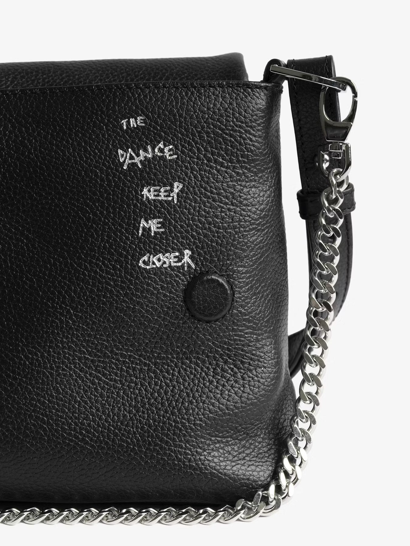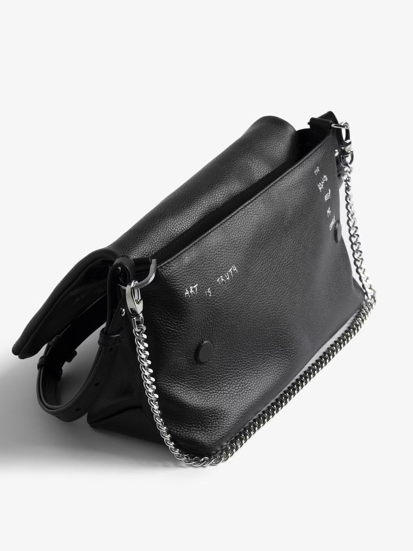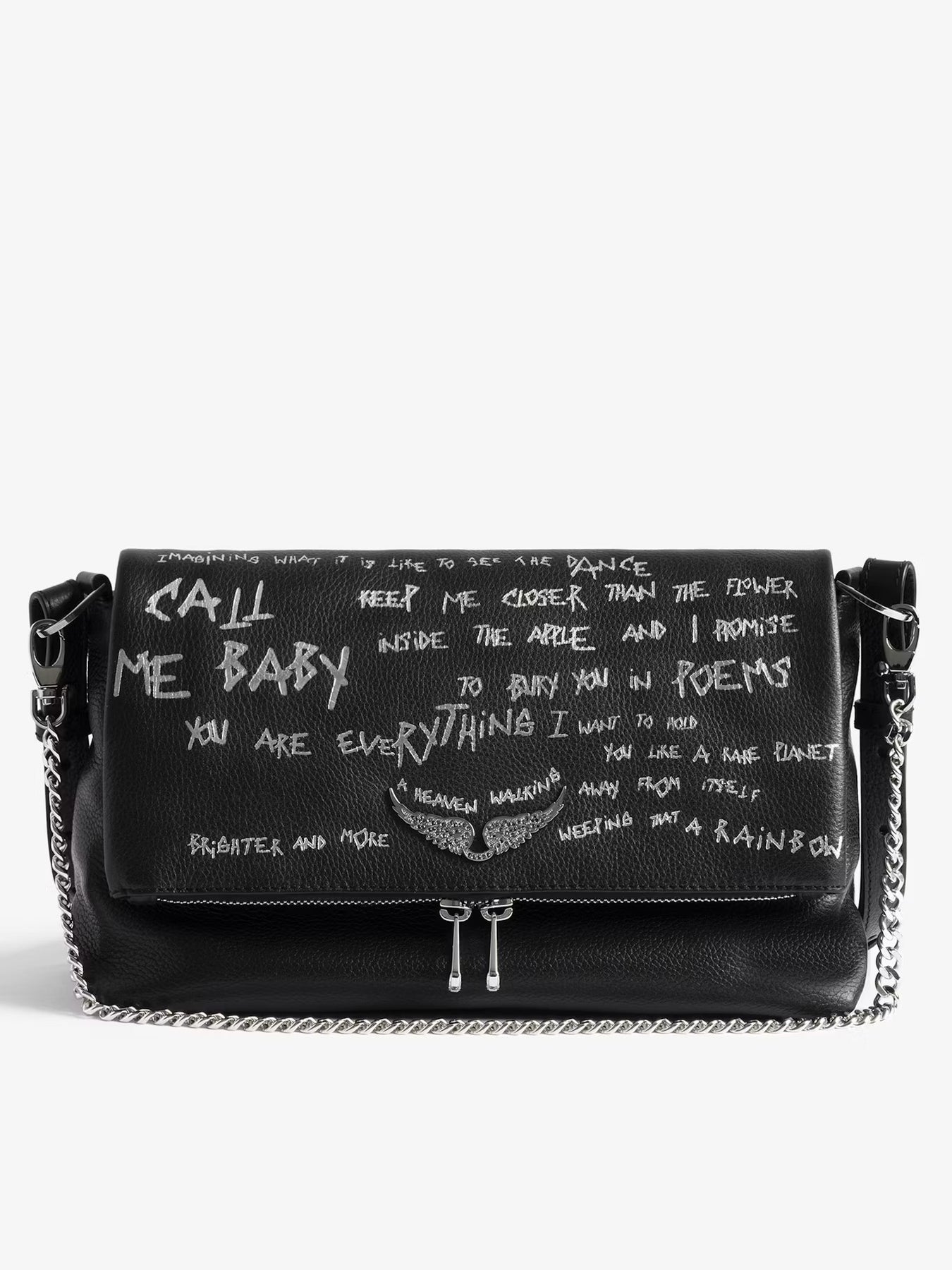Cartera cuero granulado con estampado de grafiti, cadena y alas distintivas adornadas con pedrería.