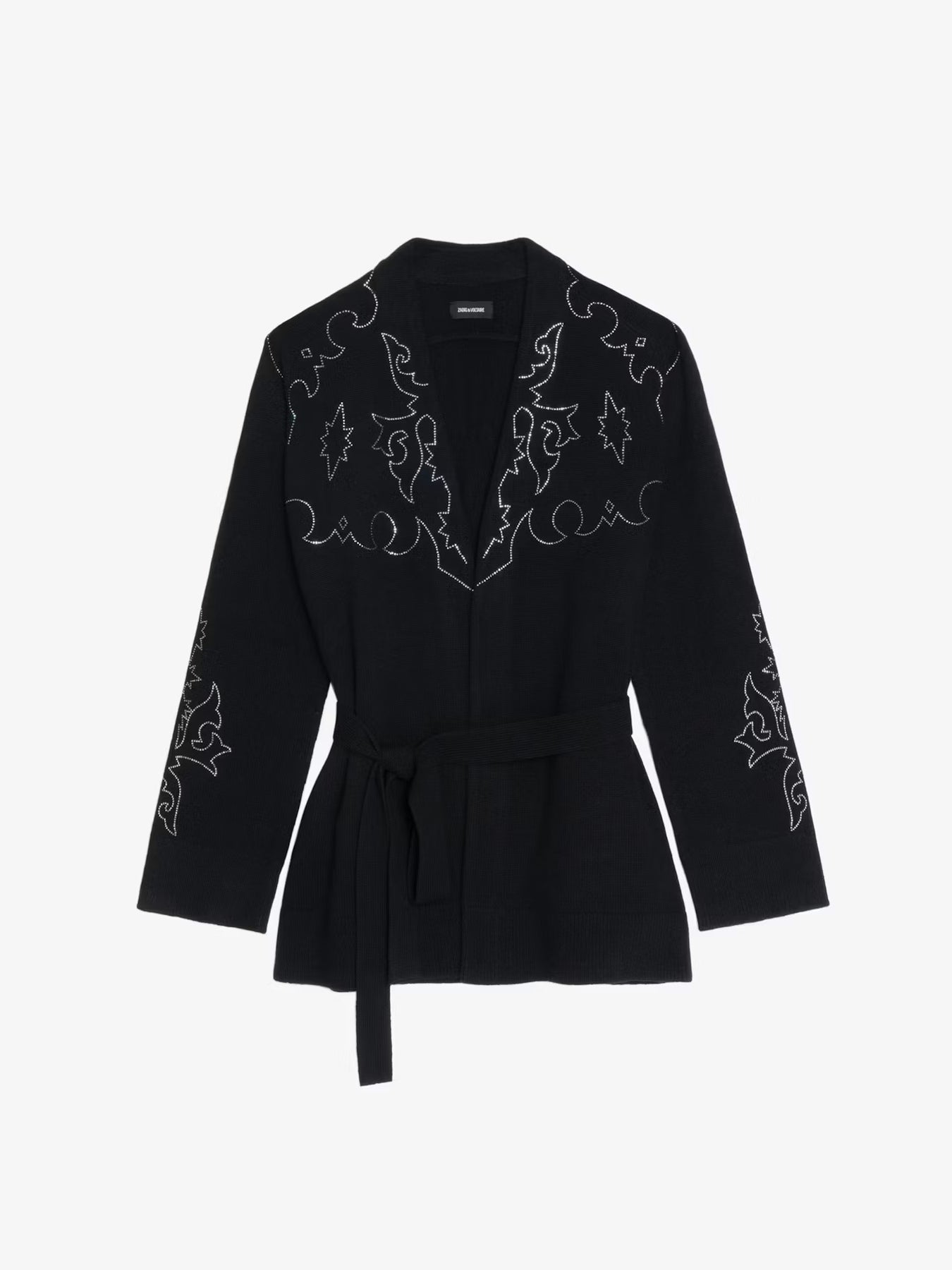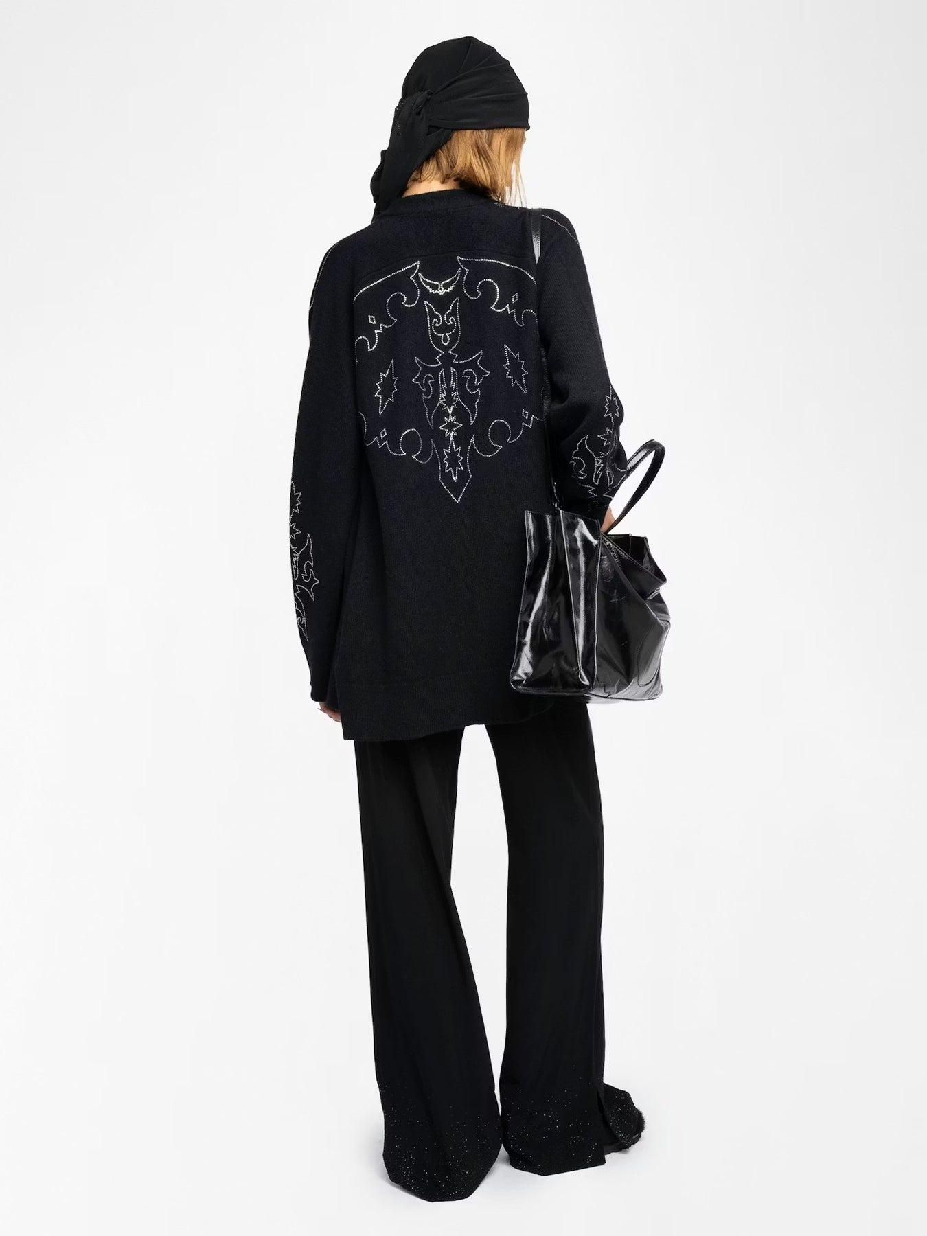 Cárdigan con babero de pedrería en la parte delantera, trasera y puños.