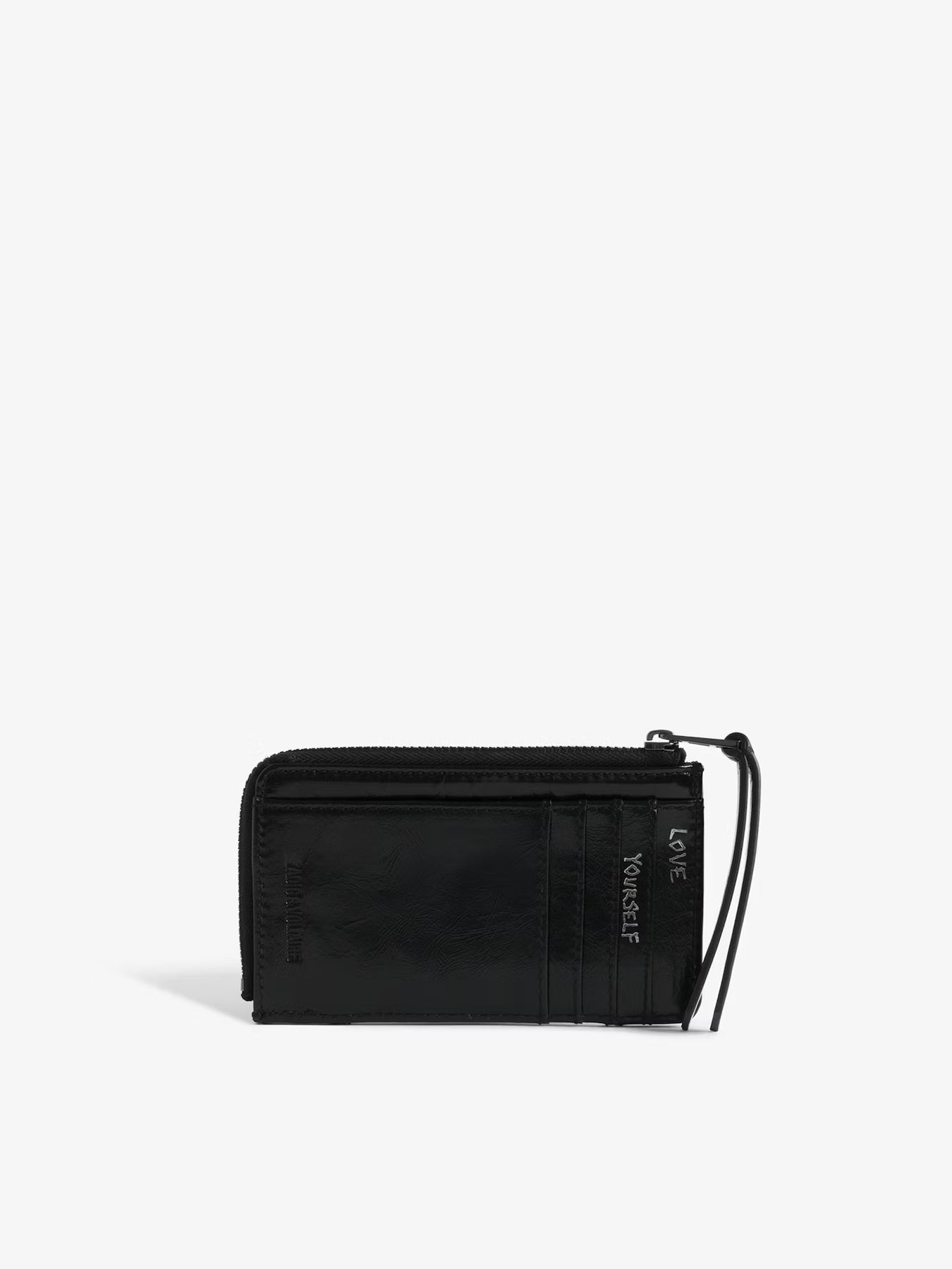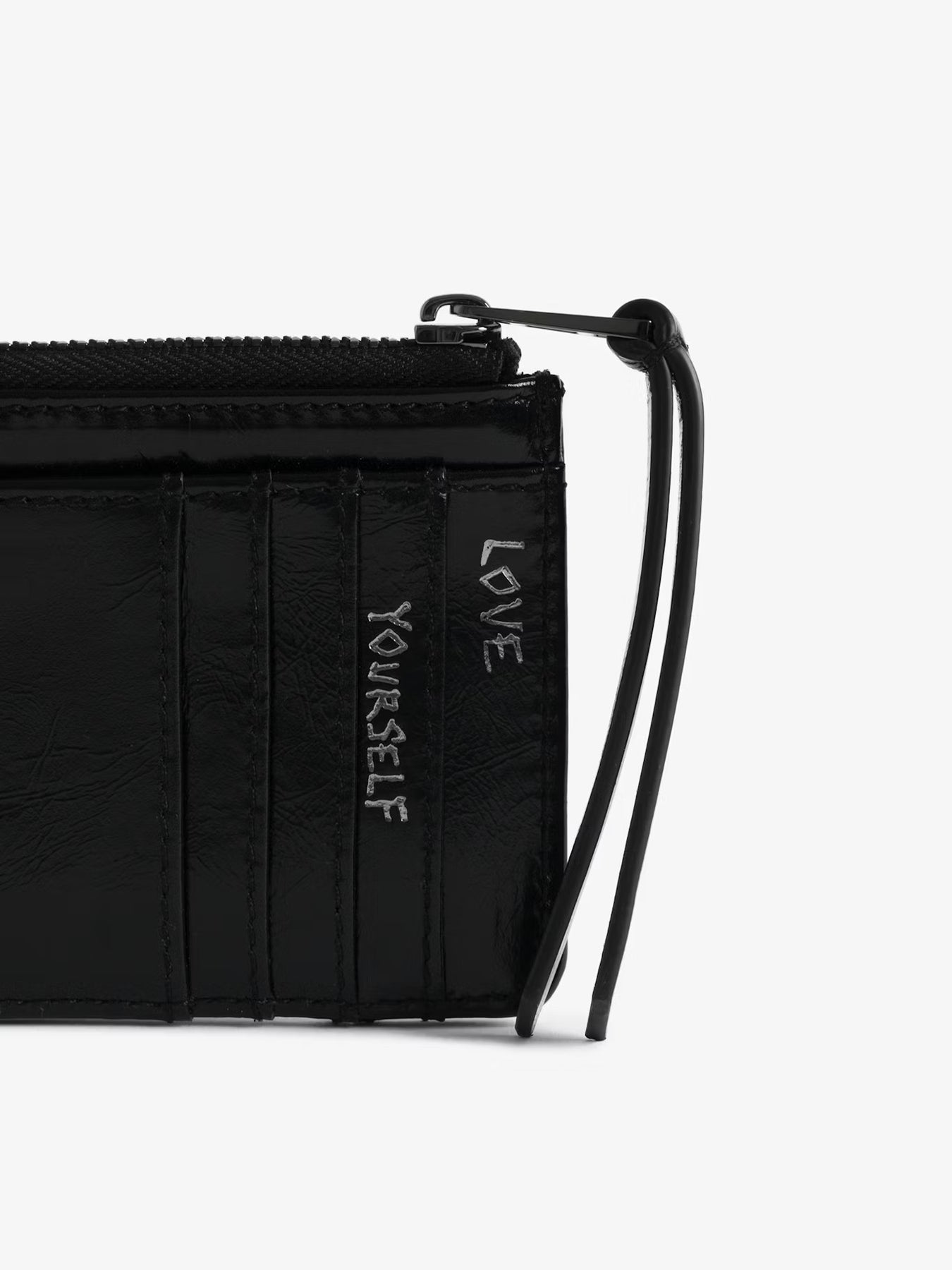Tarjetero de piel con alas distintivas y estampado de grafiti.