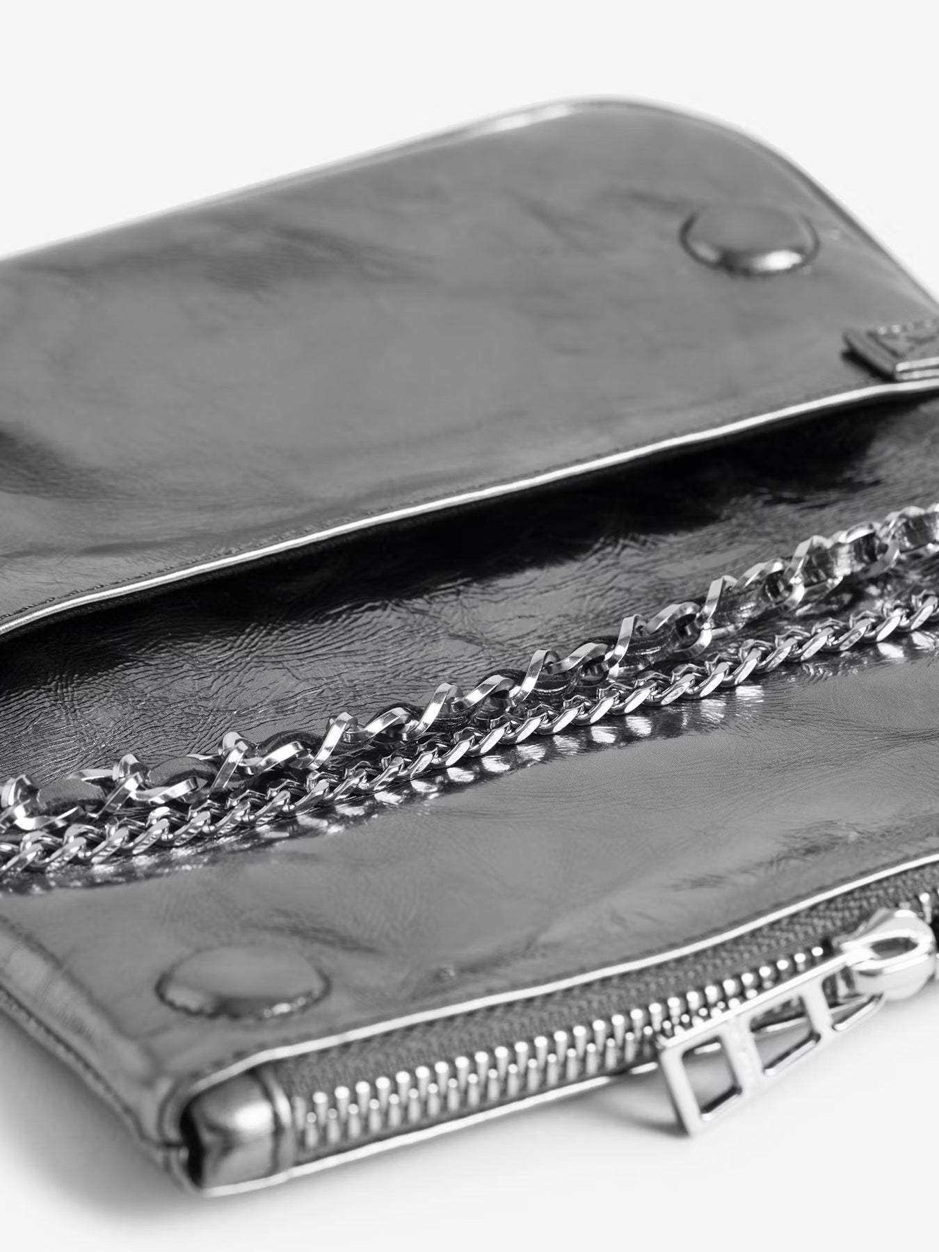 Bolso de mano de piel metalizada con alas características adornadas con pedrería.