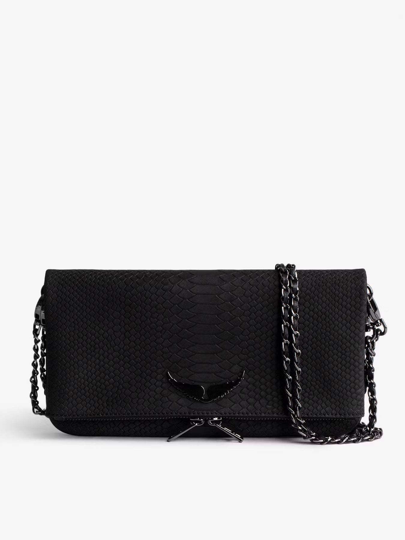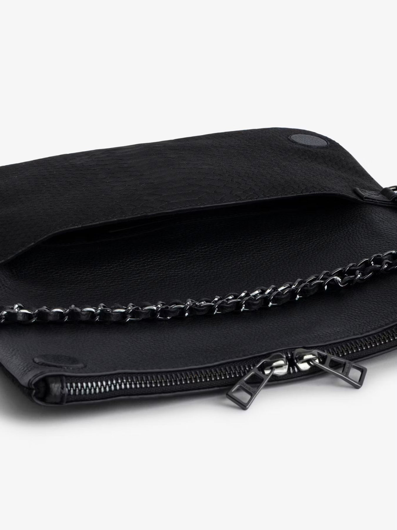 Cartera tipo clutch con cadenas y cuero en efecto serpiente.