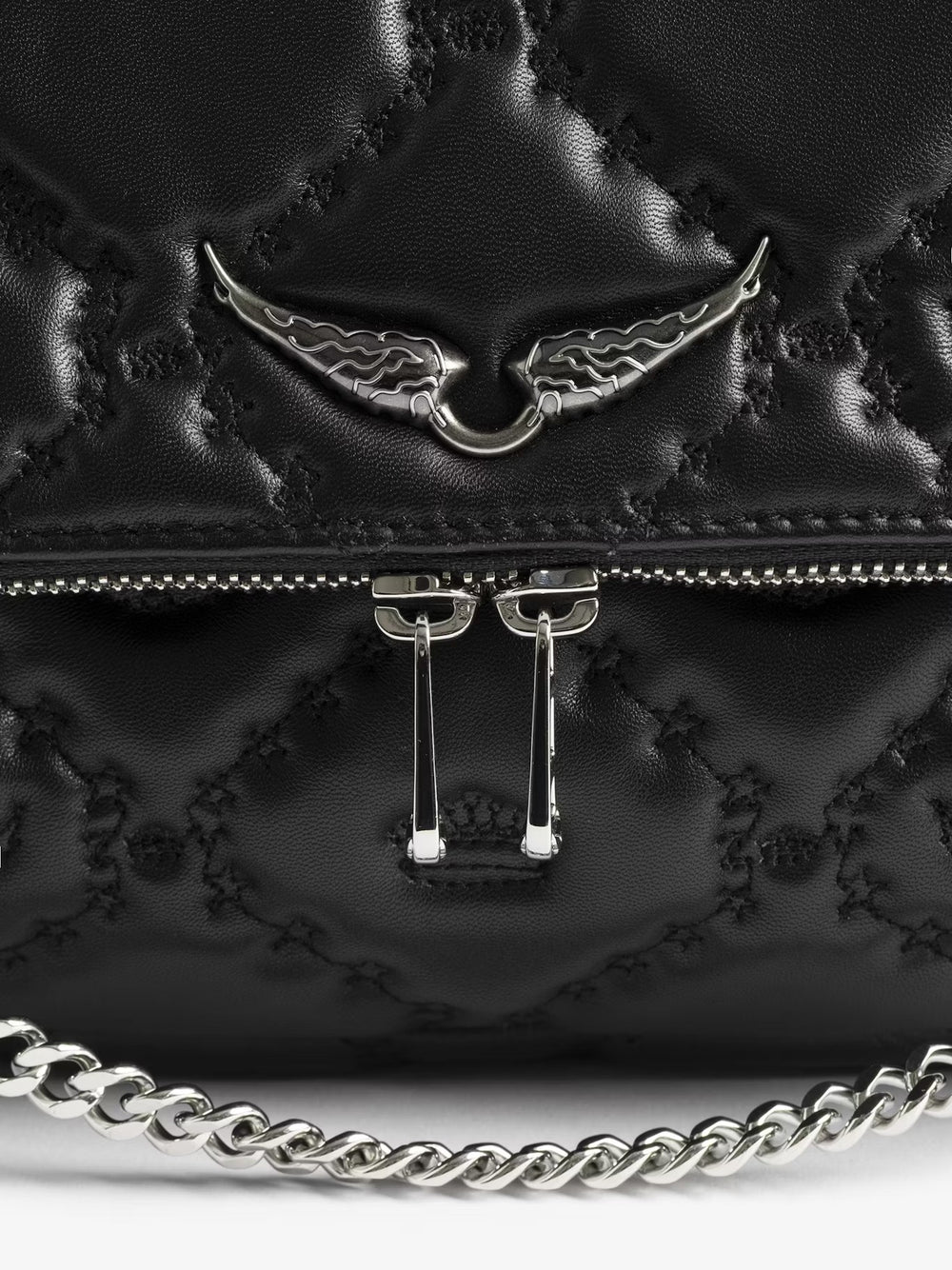 Cartera de hombro de piel suave y acolchada con monograma, cadena y alas distintivas.