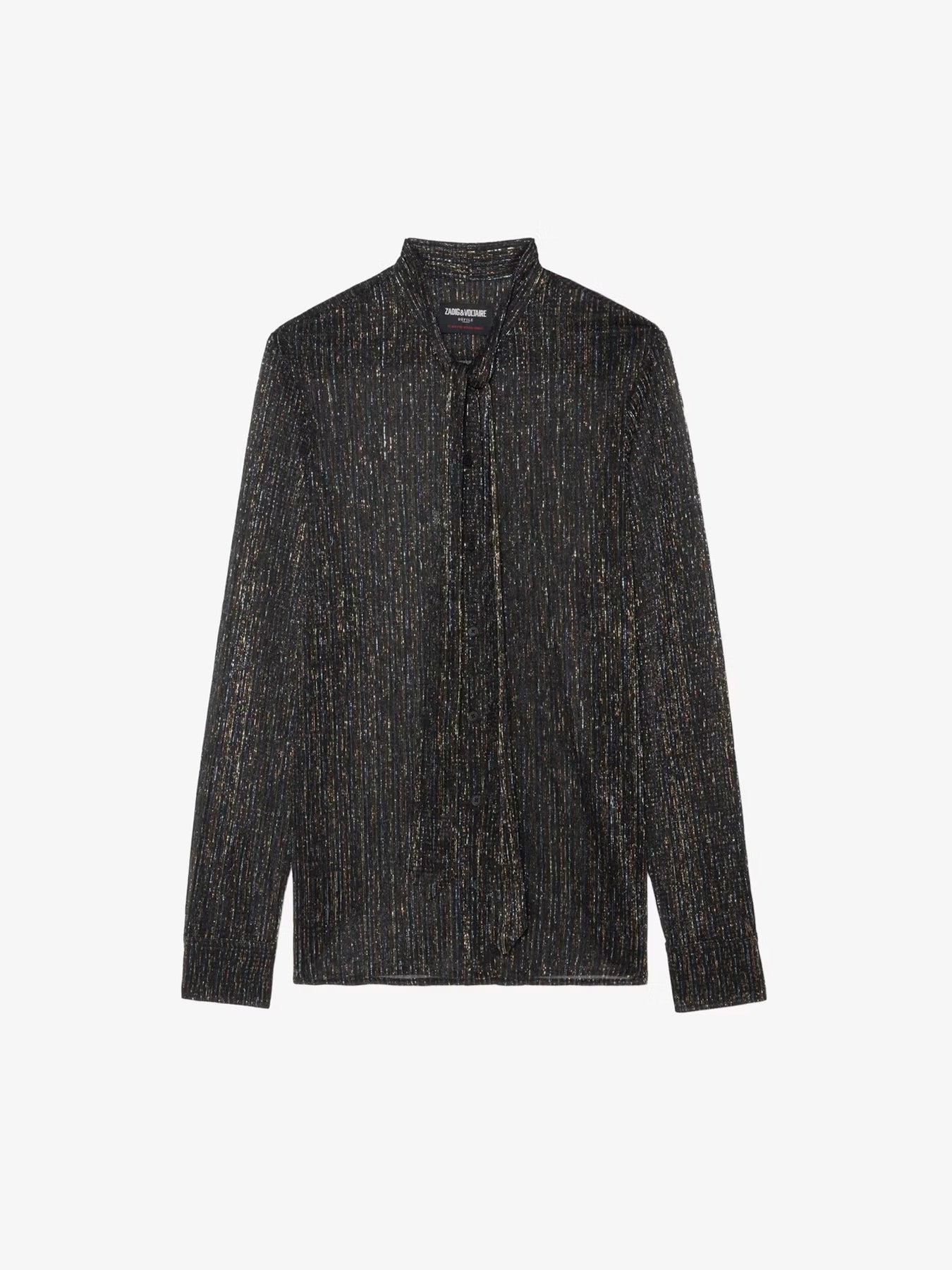 Blusa de gasa brillante con cuello lavallière, bordado de alas en la espalda y cierre de botones.
