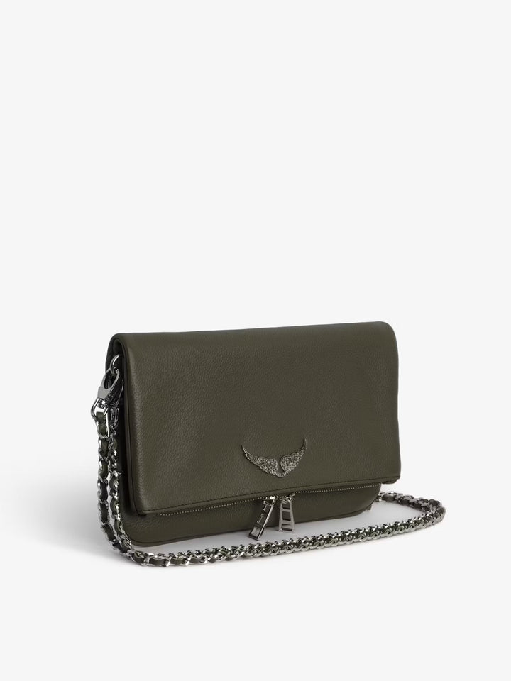 Cartera de cuero granulado caqui con doble cadena de cuero y metal y alas adornadas con pedrería.